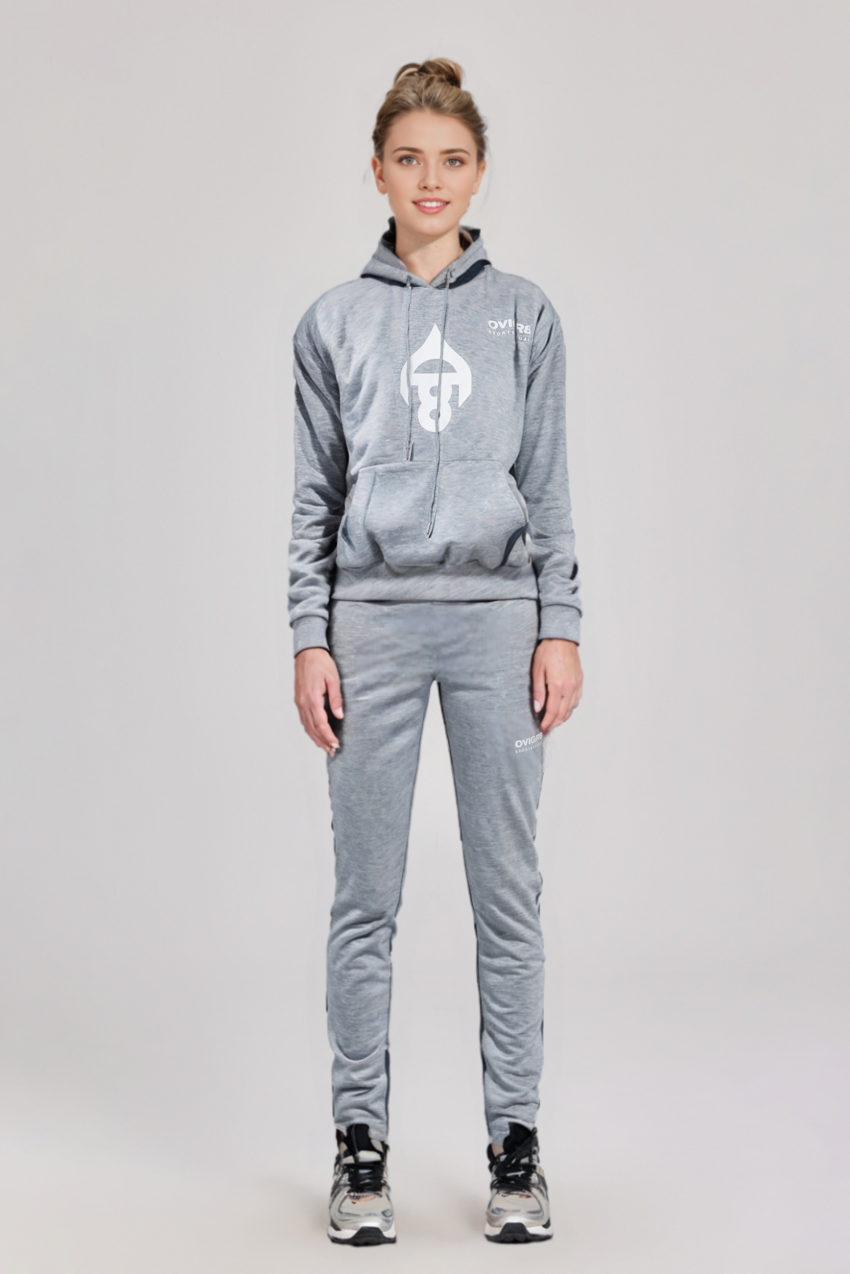 На правом бедре брюк и на груди толстовки вы увидите логотип бренда, а на левом бедре - гордую надпись OviGR8.